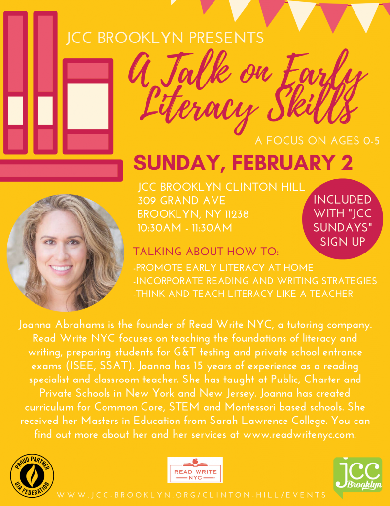 Sign up for our upcoming JCC Sunday program, February 2, and have your children play in our gym with our staff while you learn about literacy skills for your child! … Continue reading A Talk on Early Literacy Skills