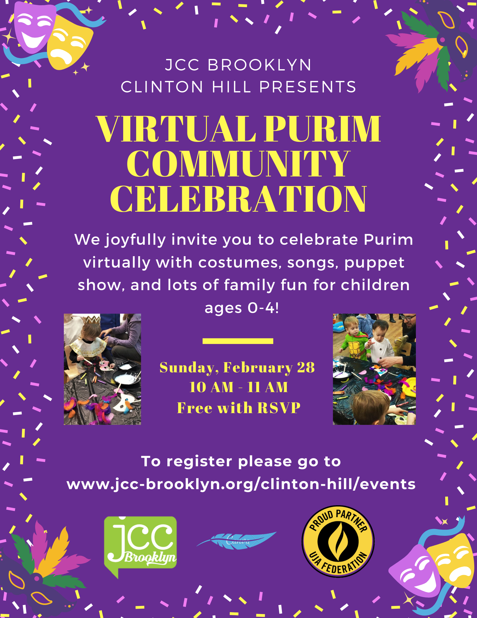 *FREE WITH RSVP* Hello Families, You are invited to a Zoom Purim Community Celebration! When: Feb 28, 2021 10:00 AM - 11:00AM Eastern Time (US and Canada) Register in advance for this meeting: https://us02web.zoom.us/meeting/register/tZUodOuprD8rHd3HZjT_5ijLtNmmJmhT41FU After registering, you will receive a confirmation email containing information about joining the meeting!